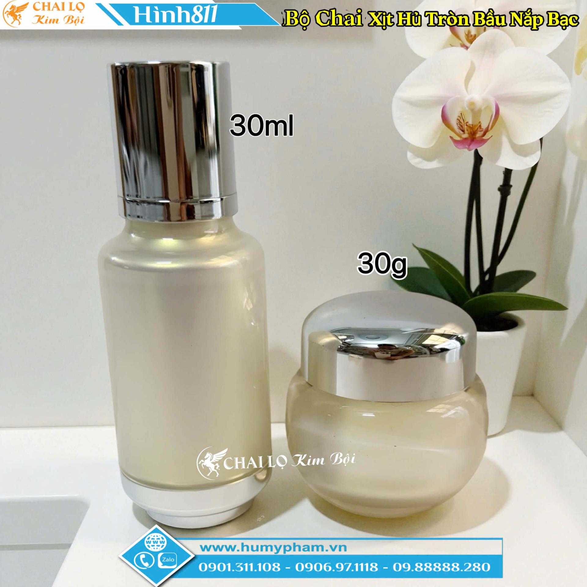 BỘ CHAI XỊT VÀ HỦ TRÒN BẦU NẮP BẠC CAO CẤP, dung tích chai đựng đươc 30ml, vòi xịt giọt, phù hợp đựng các dòng serum ưỡng da, hoặc lotion dưỡng da mặt.
