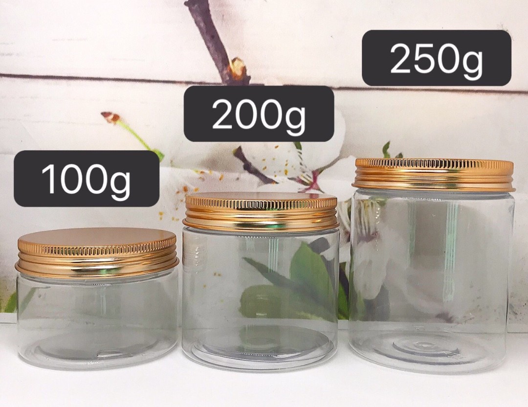 Hủ Pet Trong Nắp Nhôm Vàng, chất liệu nhựa PET trong, nắp nhôm vàng sang trọng, chuyên dùng để đựng bột, kem dưỡng da toàn thân, có 3 size : 100g 200g 300g