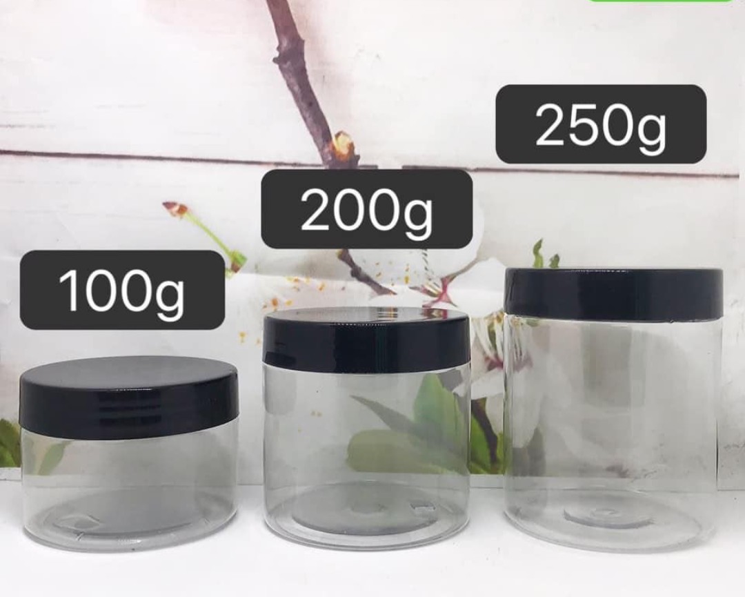 Hủ Pet Trong Nắp Đen, chất liệu nhựa PET trong, nắp màu đen sang trọng, chuyên dùng để đựng bột, kem dưỡng da toàn thân, có 3 size : 100g 200g 300g